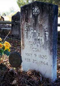 James Terrell enlisted in Company F, 6th Florida Infantry Battalion (later to become part of the 9th Florida Volunteer Infantry) on August 12, 1863. The roll for this company as published in "Soldiers of Florida," page 216, shows that he was killed at the Battle of Olustee on February 20, 1864. His youngest son, William, was born eight days later.