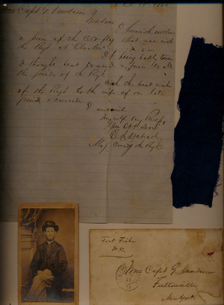 I herewith enclose a piece of the Old flag that was with the regiment at Olustee. It being badly torn I thought best to send a piece to all the friends of the regiment. With the best wishes of the regt. to the wife of our late friend and comrade.