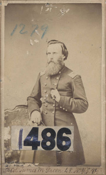 James M. Green was 32 years old when he joined the 48th New York Infantry on 5 August 1861 as a captain. He joined at Brooklyn, New York, which the history of the 48th lists as his residence. On 31 August he became commander of 'F' Company. He was promoted to major on 18 June 1862 and then to lieutenant colonel on 24 December 1862. Lieutenant Colonel Green was killed on 18 July 1863, during the assault on on Fort Wagner, South Carolina. He was shot dead as he was crossing the bastion, as he leaped on the inner parapet. One of the histories of the 48th describes him as follows: