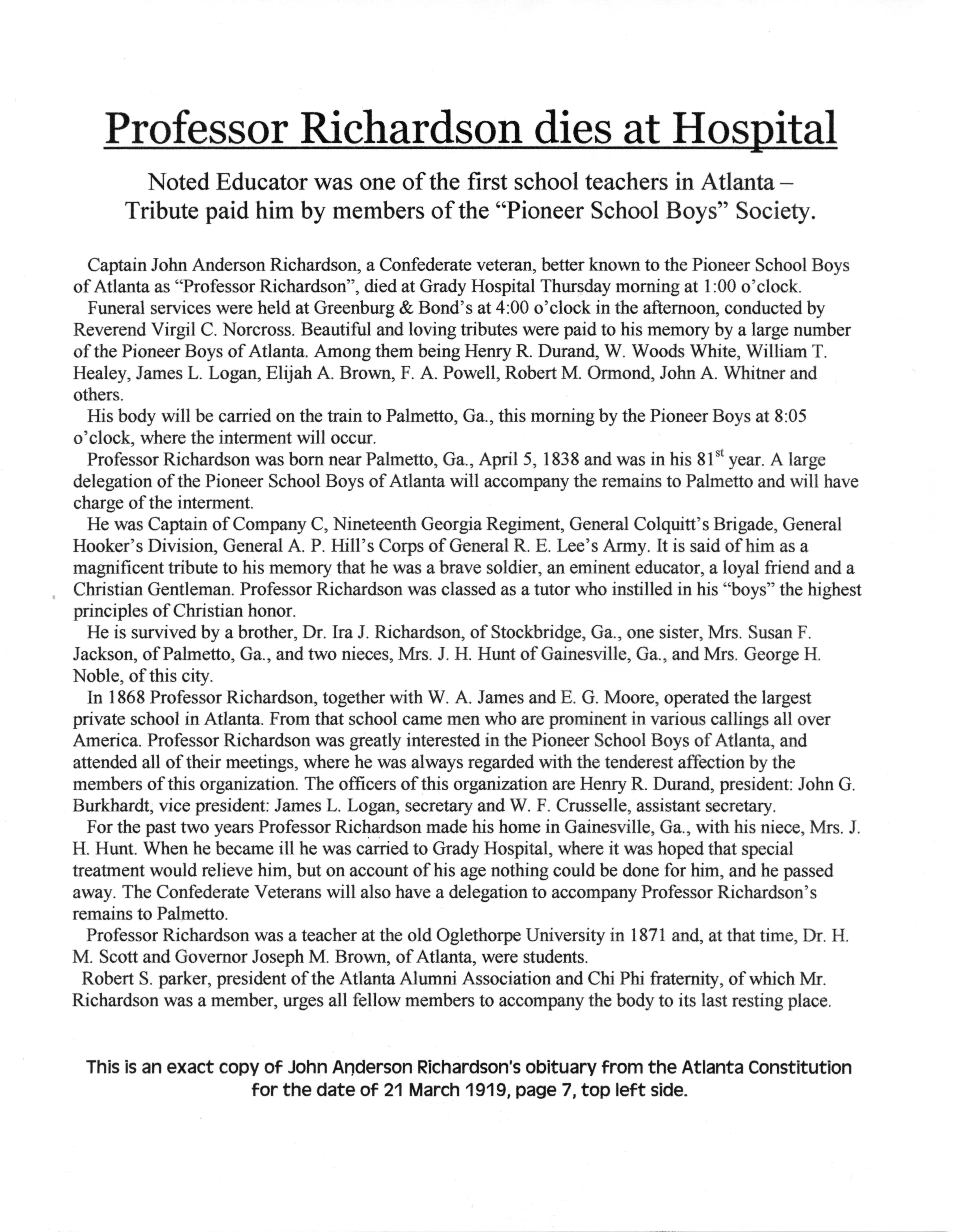Captain Richardson's obituary is in the "Confederate Veteran" magazine, Volume 27, page 147.