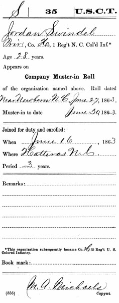 On 16 June 1863, Private Swindel was initially mustered into the First North Carolina Colored Volunteers, in New Bern, North Carolina. Swindel was born a slave in North Carolina, in or around New Bern. He ran away from the plantation and joined the regiment at Hatteras, North Carolina.