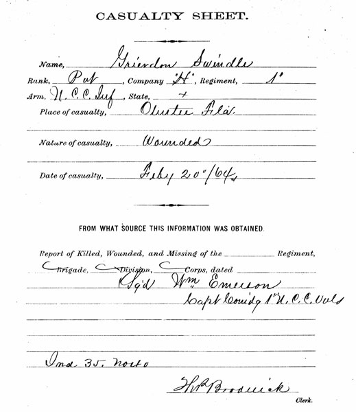Private Swindel fought in the Battle of Olustee and was wounded. The extent and kind of wound(s) he suffered are not known. After Olustee, Swindel suffered other illnesses and was hospitalized on a few occasions. This is documented by his unit's muster rolls.