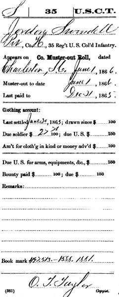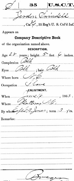 I located spellings of 'Swindel,' 'Swindell' and 'Swindle.' Also, his first name was misspelled as 'Grierdon,' pronounced at the time as 'Jerdon.' Different combinations included: "Jordan Swindel," "Jerdon Swindell," "Grierdon Swindle," "Jerdon Swindle" and "Jordan Swindle." All of these spellings are documented as being the same soldier serving in Company H, 35th Regiment, U.S.C.T. I also found spellings of "Jordon Swinton" and "Jordan Swinton" found on census and church records. Needless to say, it took me considerable research and cross-checking to confirm this information. There was only one Private Jordan Swindel—Company H, 35th Regiment—on the regiment's roster.Mr. Simmons states he is continuing to gather information and documents for a publication about his great-great grandfather.